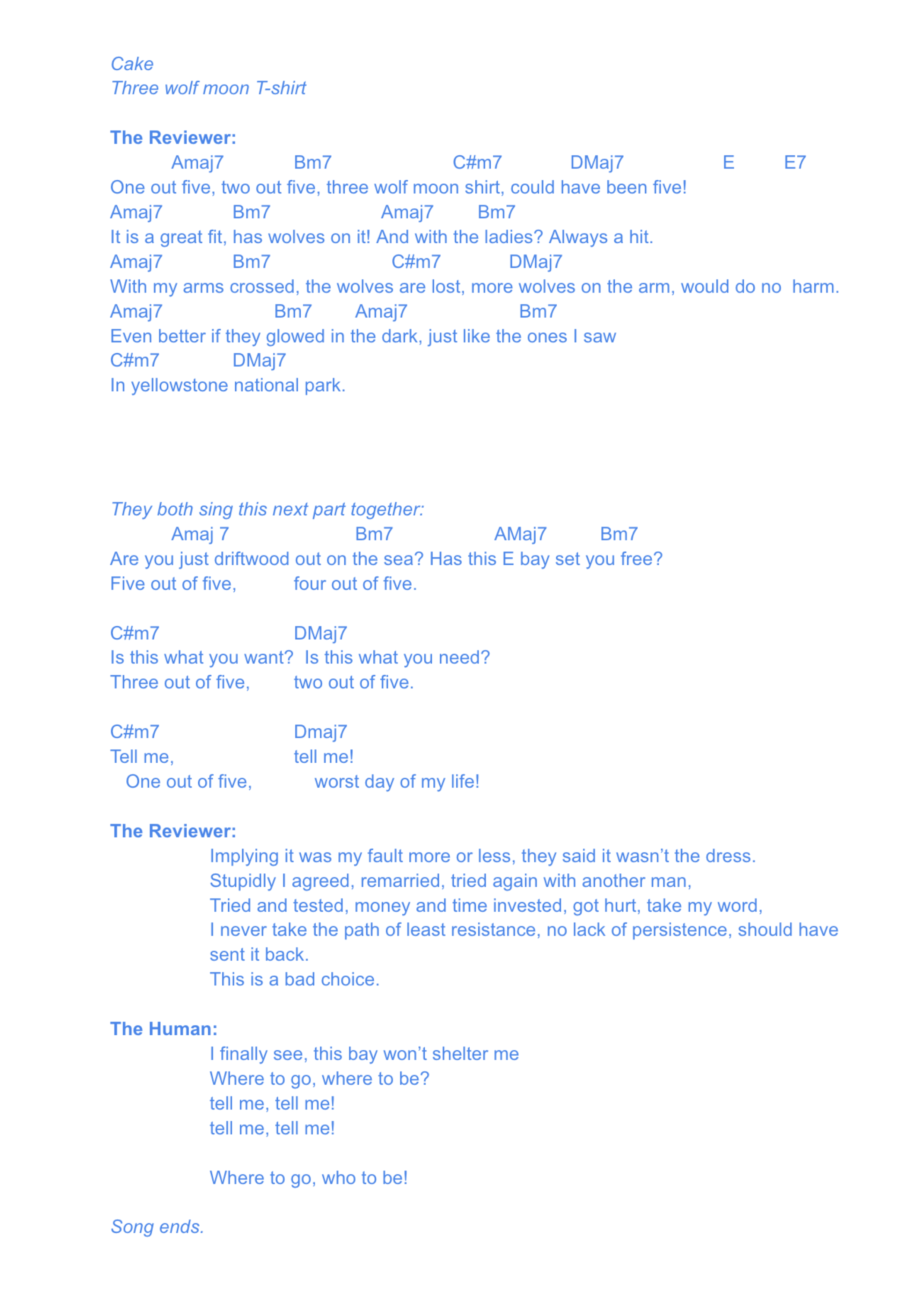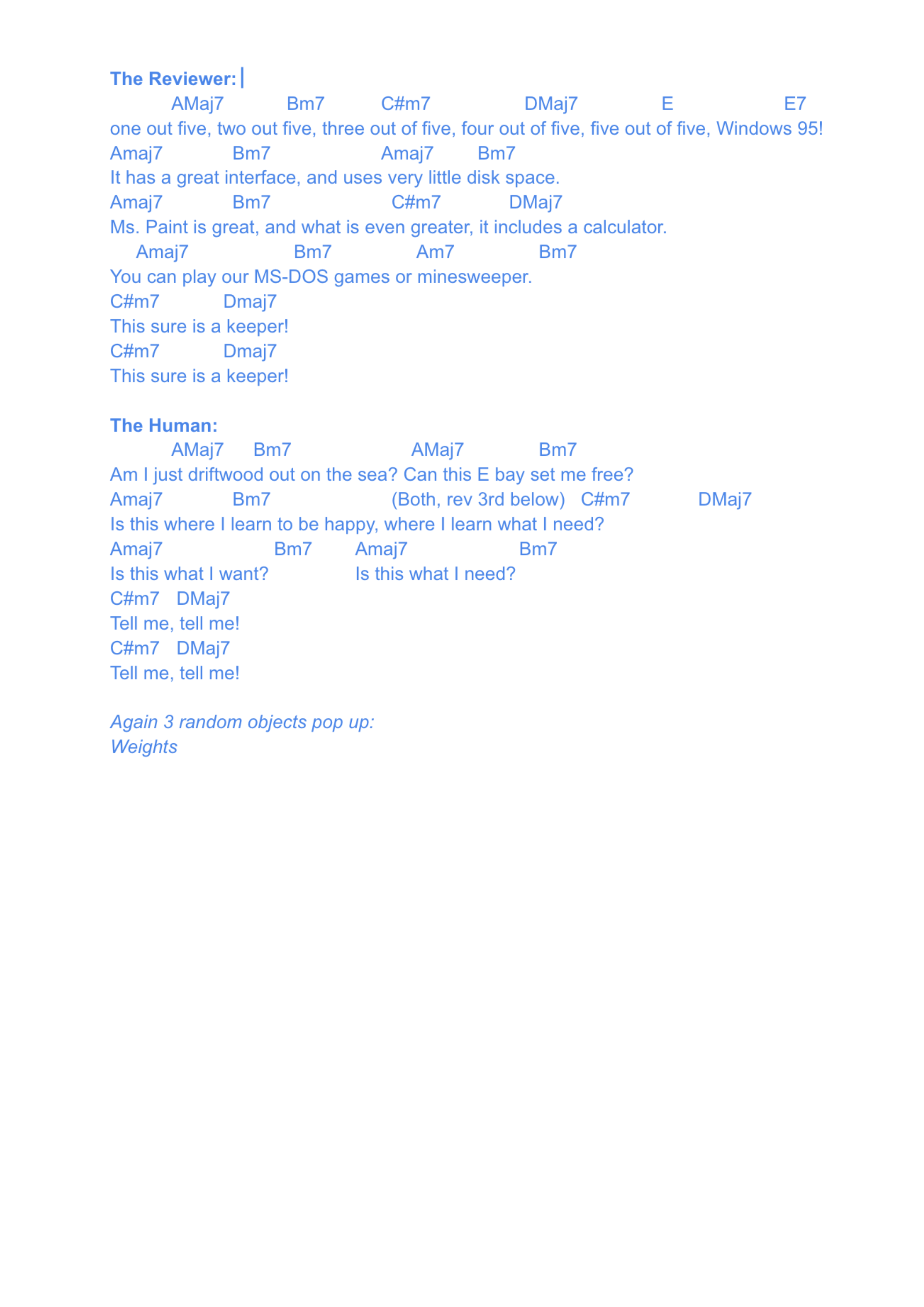 Music starts: The Reviewer song (first draft finished, need to adjust the reviewer parts to a little more uptempo/hyperactive)